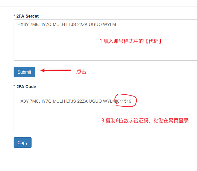 3.【* 2FA Code】框内最后面有6位数字,就账号登录的6位数字验证码,填入网页登录即可。